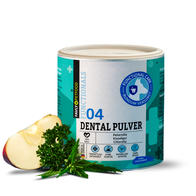 Unser DENTAL Pulver ist ideal, um die Zahngesundheit Deines Hundes zu unterstützen. Es ersetzt jedoch keine medizinische Zahnreinigung und regelmäßige tierärztliche Kontrollen sind weiterhin notwendig. Unser Pulver kann als Teil einer umfassenden Zahnpflege verwendet werden, um Zahnprobleme zu reduzieren und die allgemeine Maulgesundheit zu fördern.