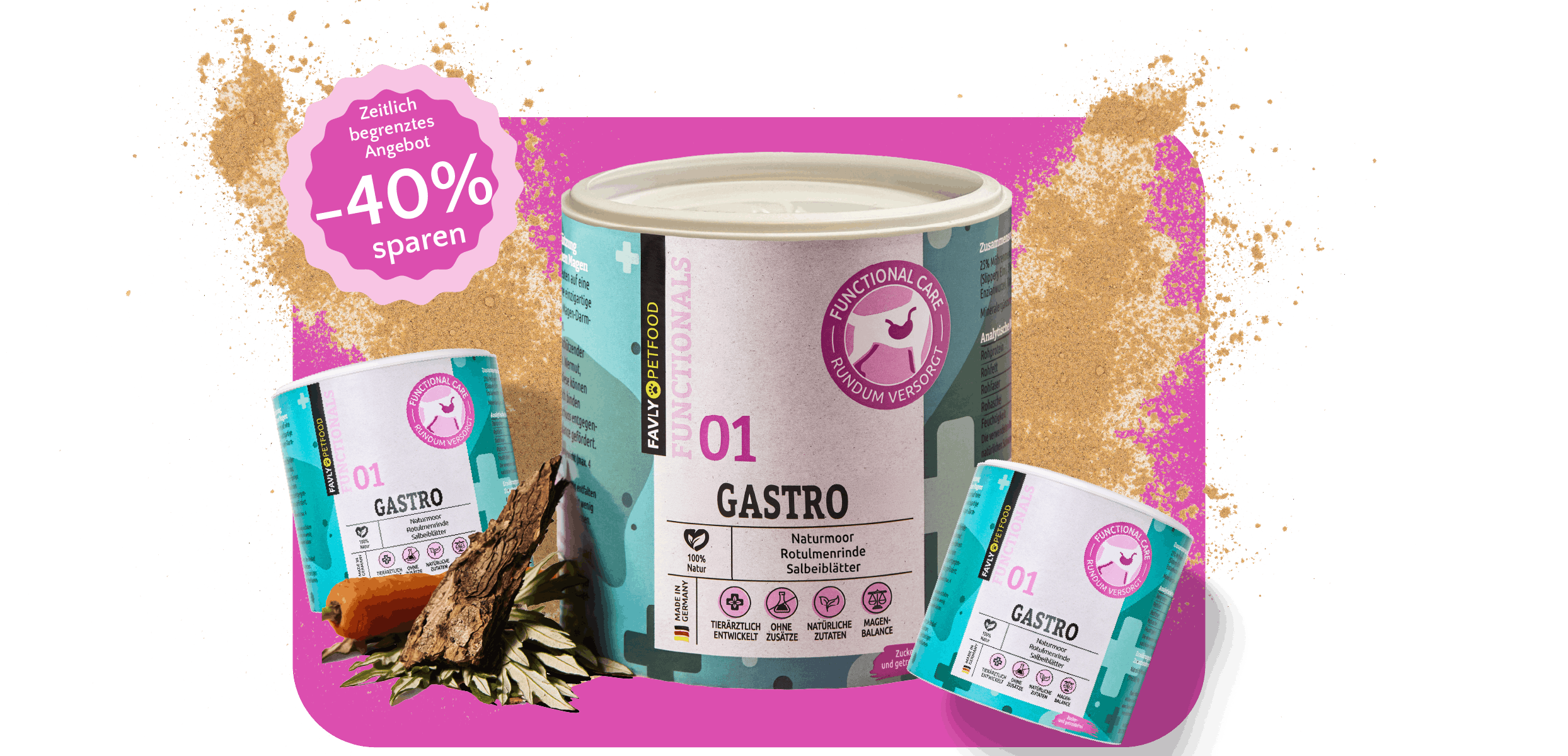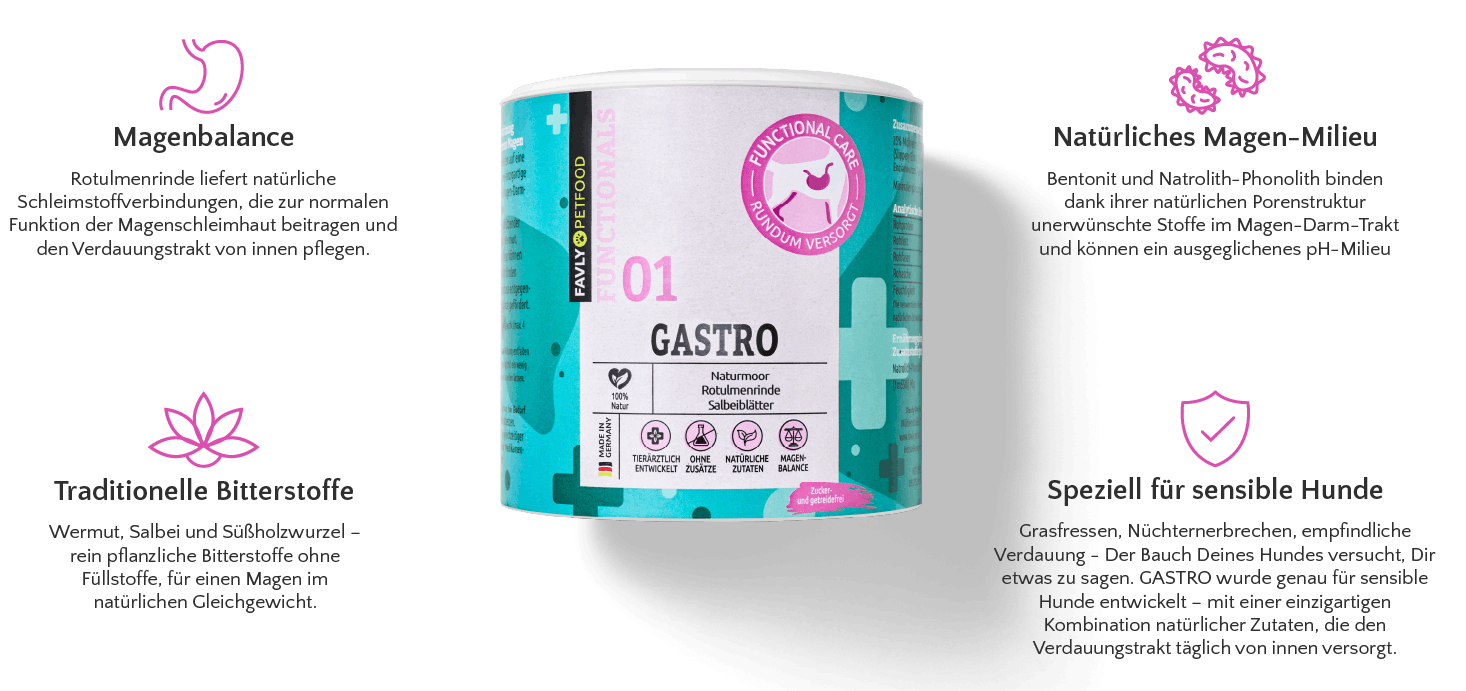 Unsere GASTRO-Produkte unterstützen Deinen Hund auf natürliche Weise bei (wiederkehrenden) Symptomen wie Erbrechen, Durchfall oder Sodbrennen z.B. nach Medikamentengabe oder Wurmkuren. Auch wenn das Magen-Darm-Gleichgewicht aus der Balance geraten ist, weil Dein Hund z.B. etwas Falsches gegessen hat, können unsere GASTRO-Produkte ihm helfen, schnell wieder fit zu werden.