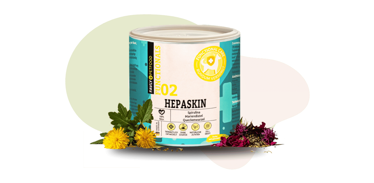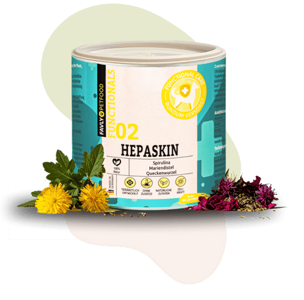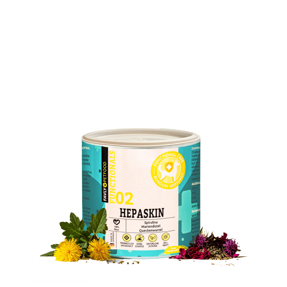 Unser HEPASKIN enthält rein natürliche Zutaten wie Mariendistelsamen, Spirulina, Löwenzahnwurzel, Hagebuttenschalen, Stiefmütterchenkraut, Queckenwurzel und Ackerschachtelhalm. Diese Inhaltsstoffe tragen zur Förderung der Hautgesundheit, einem glänzenden Fell und zur Unterstützung der körpereigenen Entgiftung bei. Für die genaue Zusammensetzung schau unter „Zusammensetzung" auf unserer Website oder auf der Produktverpackung.
