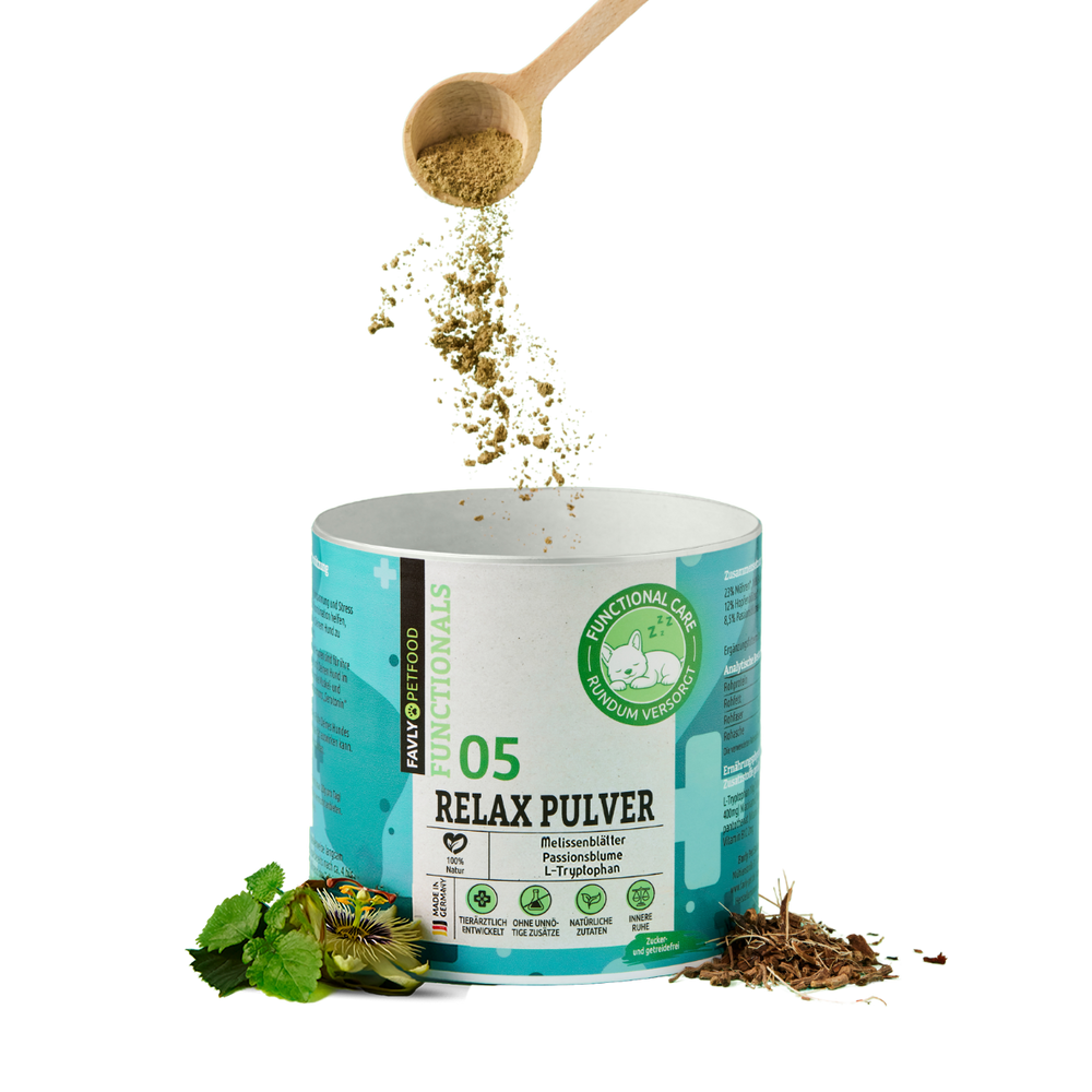 Unser RELAX-Pulver hilft, Stress und Angst zu reduzieren, fördert Entspannung und kann bei ängstlichen oder nervösen Hunden das Wohlbefinden verbessern.